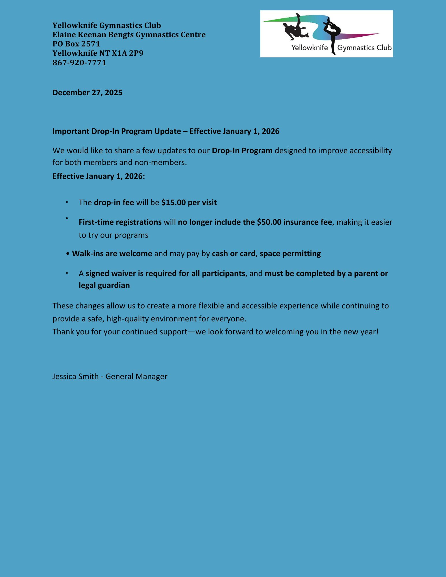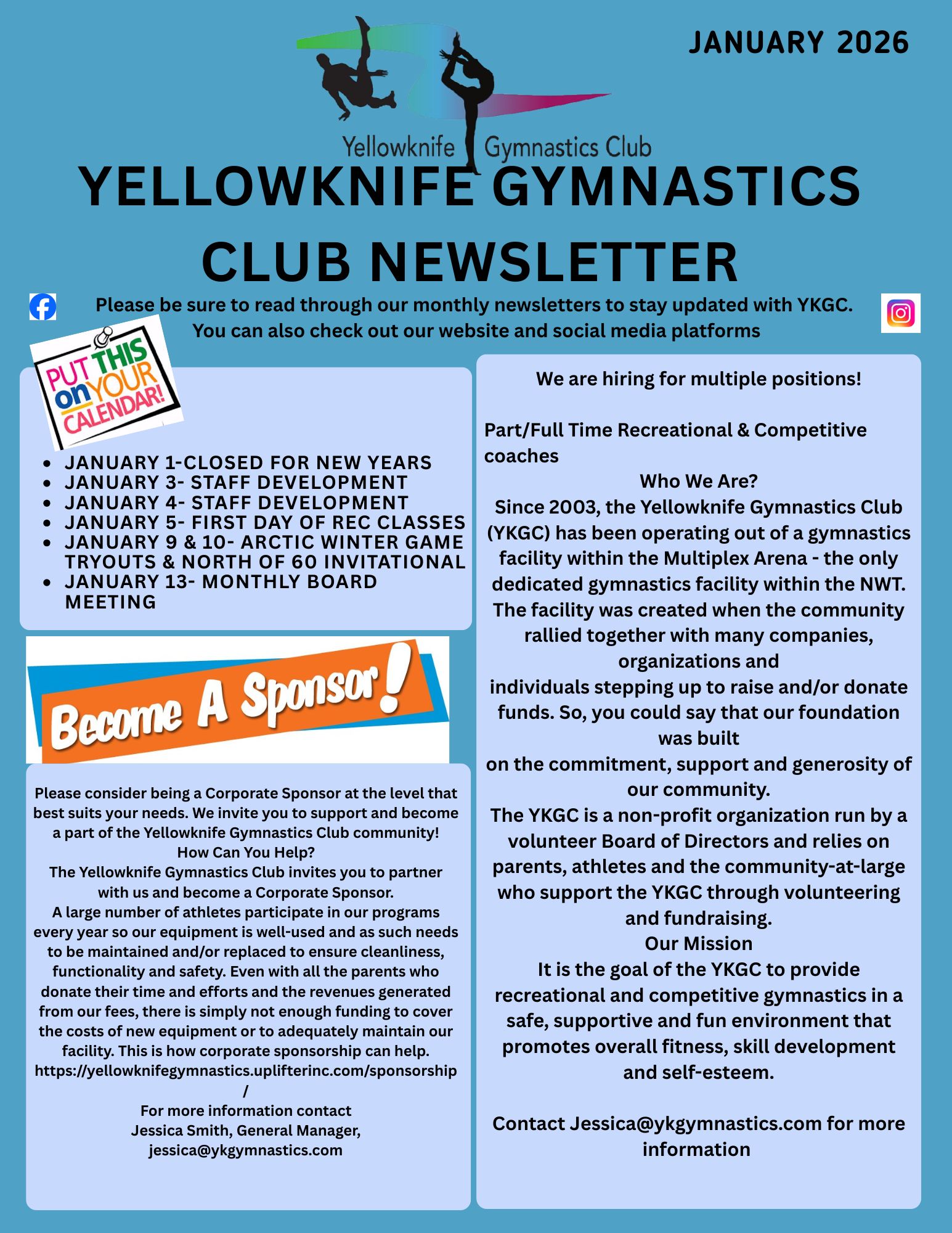 Yellowknife Gymnastics Club Elaine Keenan Bengts Gymnastics Centre News JANUARY 2026 NEWSLETTER posted Jan 1, 2026, 8:00 AM